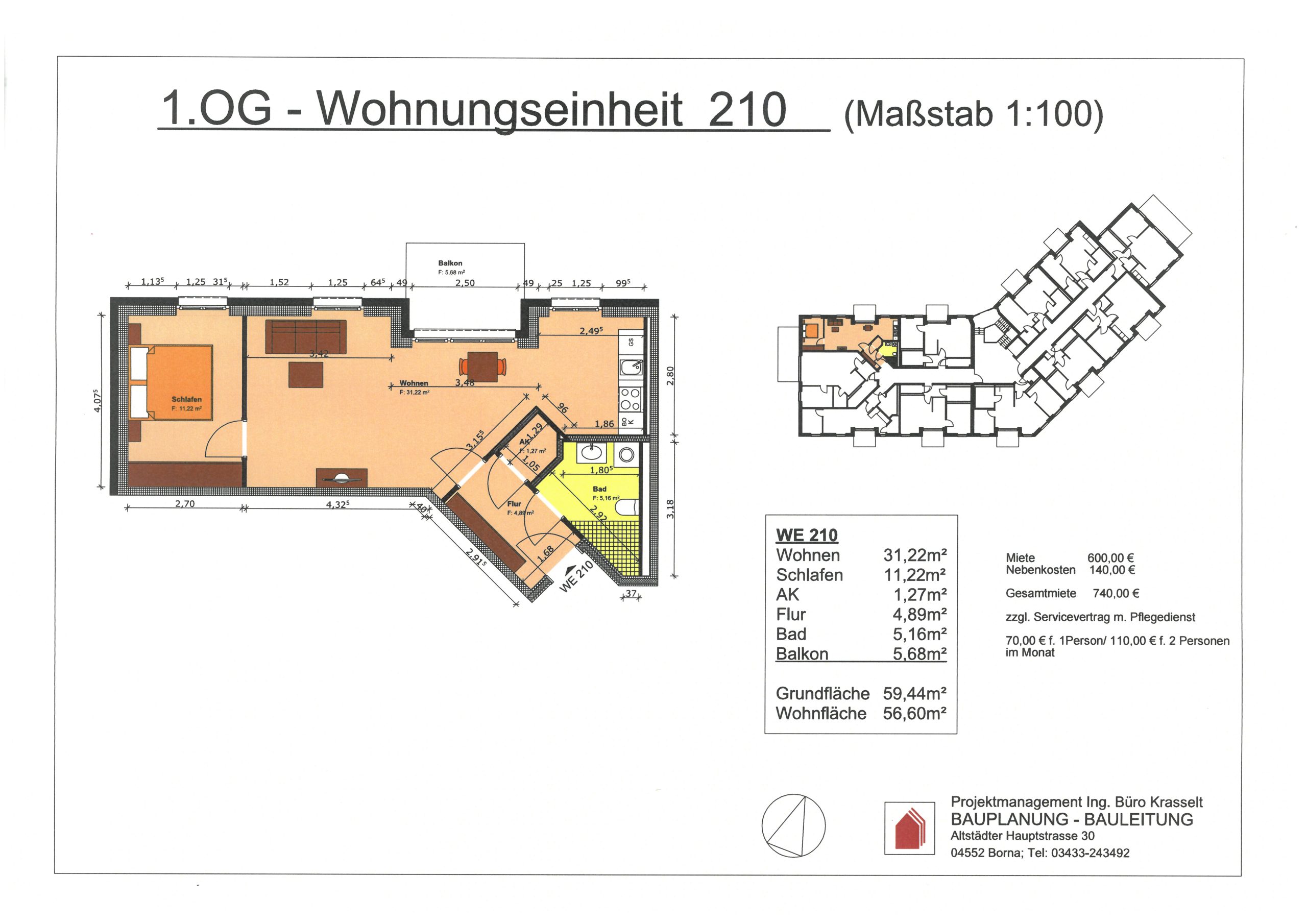 Die Wohnung befindet sich im 1. Obergeschoss und ist mit Ihren 56m² ideal für zwei Personen. Es ist eine 2-Raum Wohnung mit separatem Abstellraum, einem Bad mit ebenerdiger Dusche und mit einer voll ausgestatteten Küche. Die Wohnung verfügt über einen geräumigen Balkon welcher Richtung Westen zeigt.
